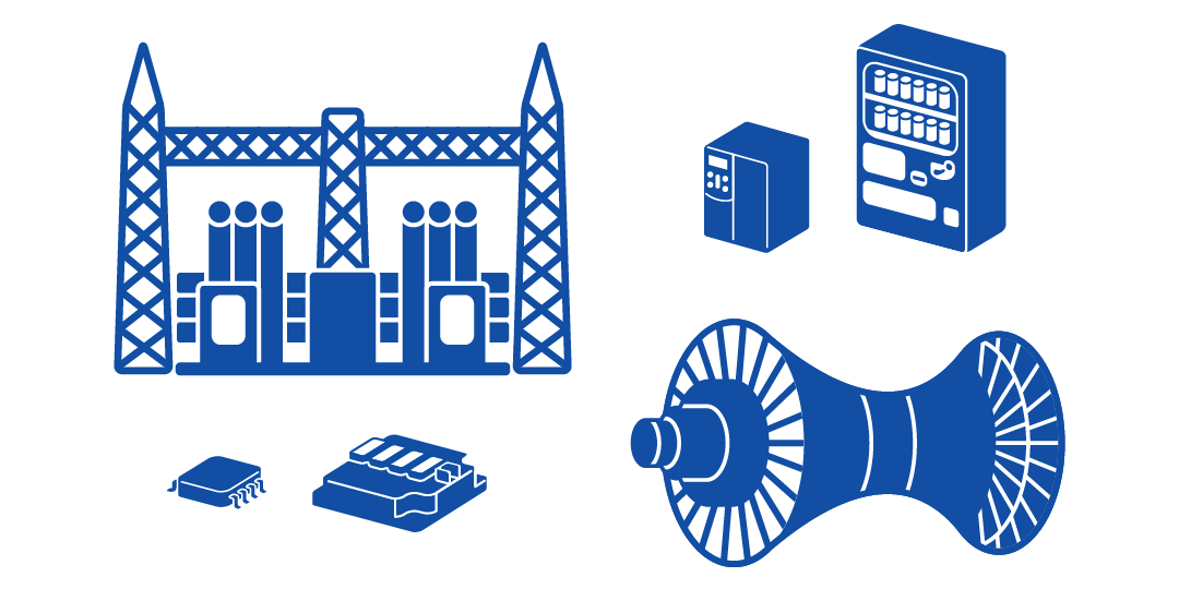 Based upon the experience and knowledge, Fuji Electric has products ranging from small Semiconductor to larger Power Plants. We provide total solutions contributing to lower energy consumption to a range of customers. (* Numbers of items are based on product models types)