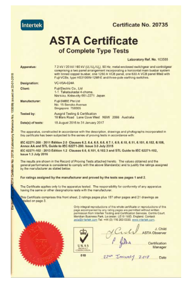 Fuji VC-V6A and VC-VS6A are the products designed and manufactured utilizing Fuji Electric leading-edge technology, with IEC62271-200 standard certificate by third-party notified body (STL member).