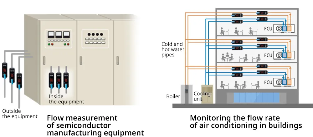 Ultrasonic flowmeters are devices used to measure the amount of liquid that flows through pipes. These devices have long been used in factory plants. In recent years, however, the range of applications has expanded. For example, they are now used to reduce costs by measuring the amount of pure water and chemicals used in semiconductor manufacturing plants, or to control the amount of heat on each floor by adjusting the amount of cold water and hot water flowing into air conditioners in buildings and offices.
