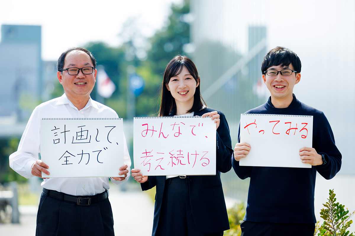 Kishiro (left), who wrote “Planning and Full Effort,” relates, “Deadlines make work challenging, but planning and full effort will be your strengths.” Miyamoto (center) wrote “Keep Thinking Together,” explaining, “The workplace is full of professionals, so when things don't go well, you can find a way by continuing to put your heads together.” Masuda (right), who wrote “Just Try,” responds, “When there is something I don’t understand initially, what I do first is to just try it out to get a sense for it.”
